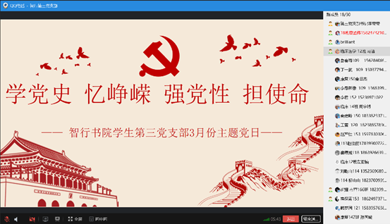2021年是中国共产党成立第100周年,为引导党员筑牢信仰之基,补足精神之钙,砥砺初心使命,锤炼坚强党性,3月18日智行书院学生第三党支部结合实际情况,开展了“学党史、忆峥嵘、强党性、担使命”主题党日活动。