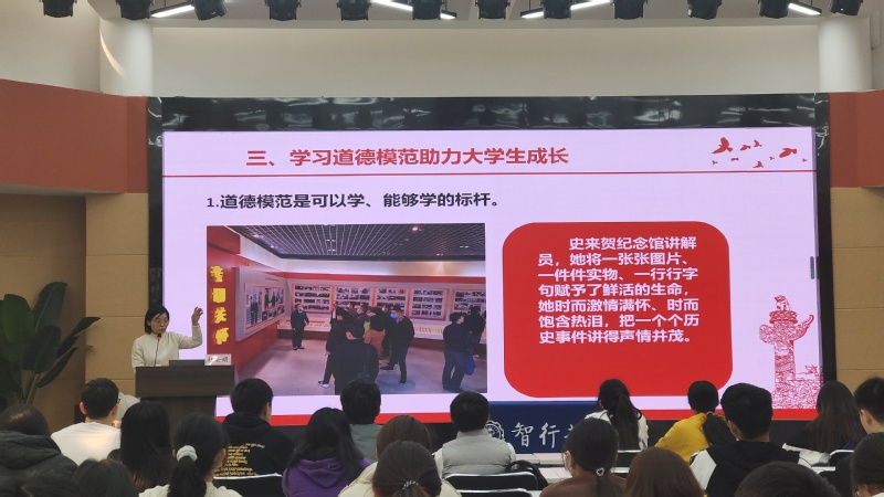 11月19日上午,赵云娟以“学习道德模范,感动更要行动”为主题为书院学生代表讲授思政课。赵云娟从“道德模范的内涵、学习道德模范的时代价值、学习道德模范助力大学生成长”三个方面讲述了学习道德模范的重要性和必要性。赵云娟也勉励学生要以道德模范为标杆,从先进事迹中汲取道德营养,坚定理想信念,砥砺前行。