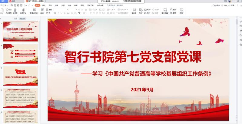 智行书院学生第七党支部9月17日晚开展了专题党课学习。活动由党支部书记胡海洋同志主持,第七党支部全体同志参加。