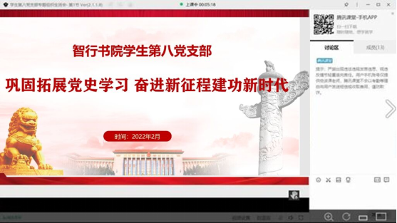 2月25日,智行书院学生第八党支部在腾讯课堂开展以“奋进新征程·建功新时代”为题的主题党日活动,本次会议由学生第八党支部书记娄冰琼主持,学生第八党支部全体党员参加。