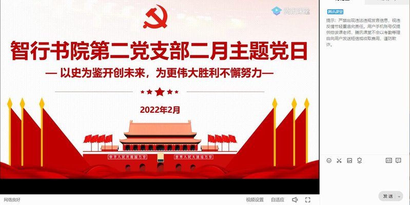 2月25日下午,智行书院学生第二党支部于腾讯课堂召开二月份主题党日,讨论《习近平在省部级主要领导干部学习贯彻党的十九届六中全会精神专题研讨班开班式上发表的重要讲话》,党支部全体党员同志参加,会议由党支部书记杨卫红主持。