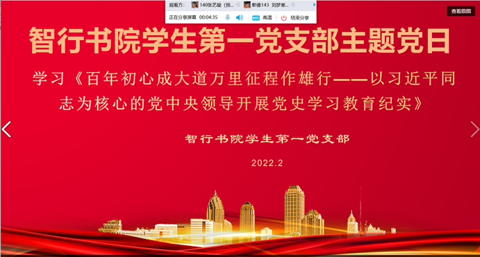 2月22日晚,智行书院学生第一党支部在腾讯会议开展“学习《百年初心成大道万里征程作雄行——以习近平同志为核心的党中央领导开展党史学习教育纪实》”主题党日活动。本次会议由支部书记陈林同志主持,第一党支部党员全体参加。