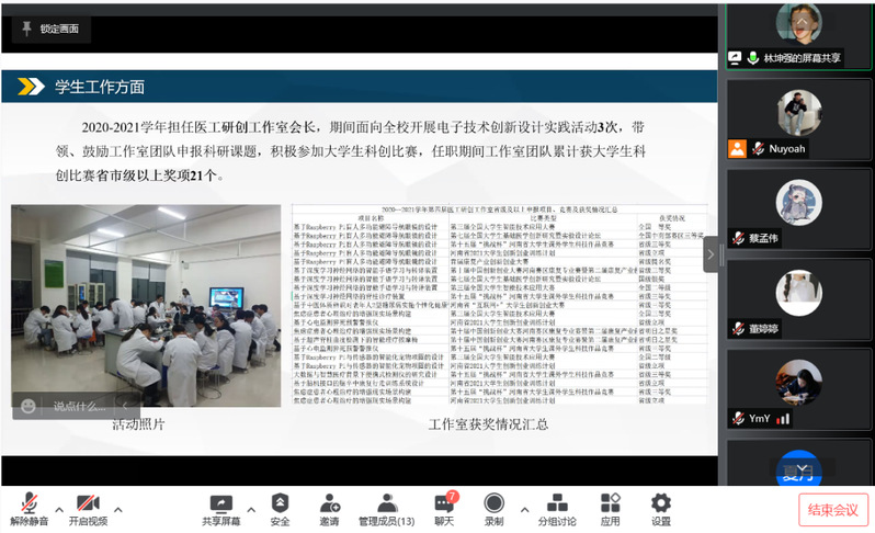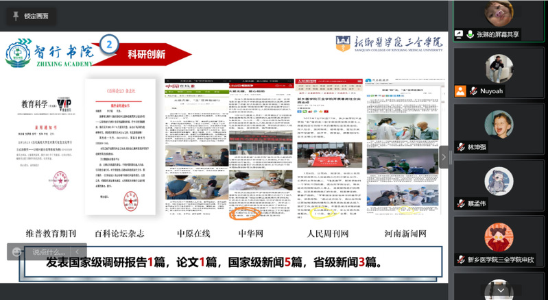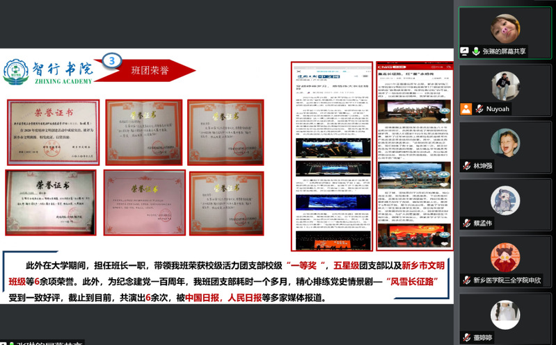 为落实立德树人根本任务,大力弘扬伟大建党精神和抗疫精神,充分发挥青年大学生先进典型的示范带动和价值引领作用,根据《关于开展2022年新乡医学院三全学院“最美大学生”宣传推介活动的通知》要求,智行书院于4月3日举办“最美大学生”线上评选会,书院党总支书记刘凯、教师及学生代表出席本次会议并担任评委。