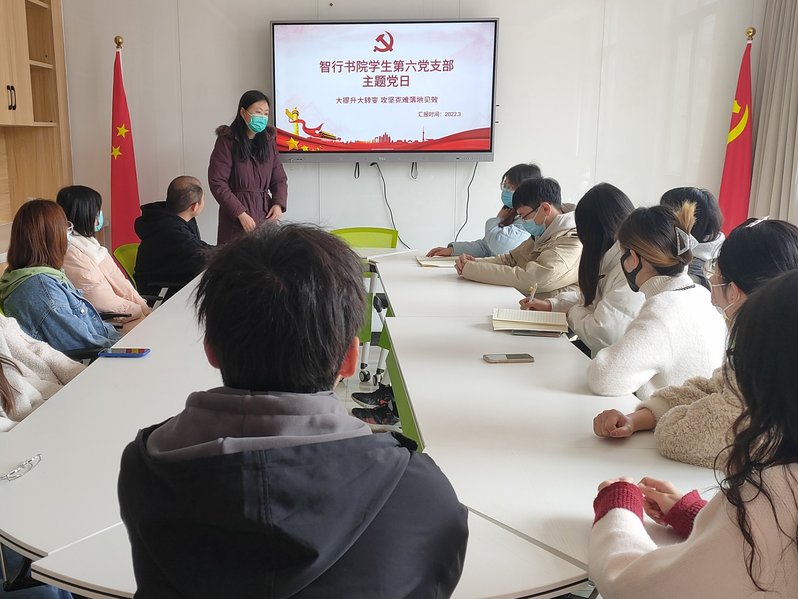 3月24日,智行书院学生第六党支部在2#公寓三楼党员工作站开展“大提升大转变,攻坚克难落地见效”主题党日活动,会议由党支部书记苗琨主持,党支部全体党员参加。