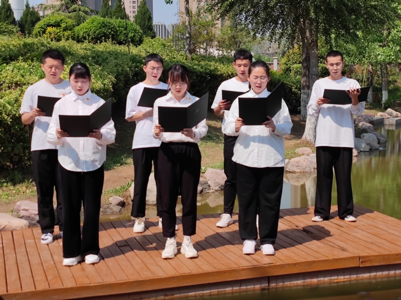 学生第五党支部成员以诗歌朗诵的形式,弘扬法律精神。“我曾经一次次感动,感动法律阳光照耀心灵,鸟语花香,大地飞歌,文明春风洒满历城每一个角落,从此,法在我心中,神圣而又亲切……”优美的配乐,深情的朗诵,真挚的情感……他们激情澎湃、情感丰富,展现了青年党员昂扬向上的风貌,筑牢了全体党员纪律严明的思想根基,传播了学法、尊法、守法、用法的法治内涵和公平、正义、和谐等法治理念。