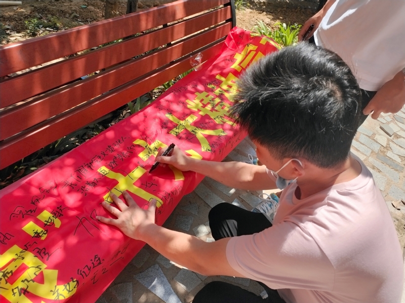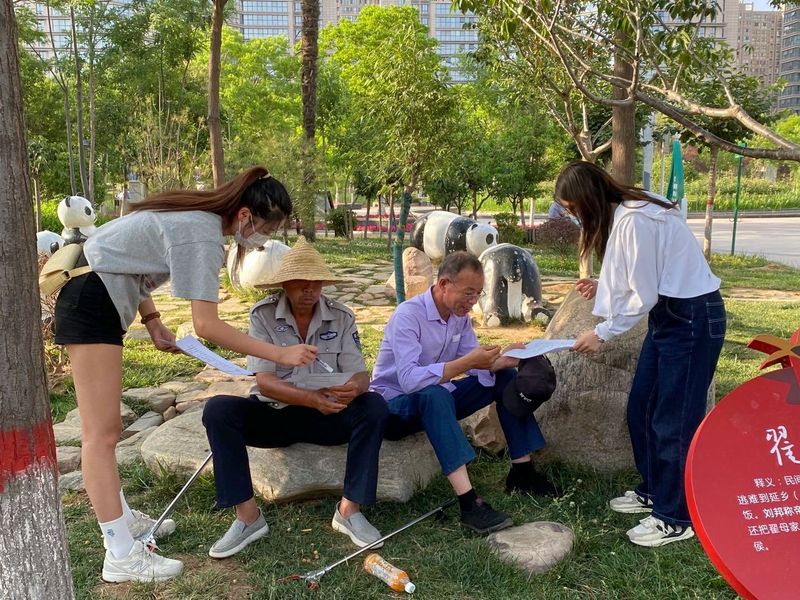 线下实践过程中,实践团队来到新乡市和谐公园,通过集体创作的以“社会主义核心价值观”为主题的红色故事和书法作品,让更多群众了解“中国梦”内涵,引导将“个人梦”与“中国梦”联在一起,共筑“中国梦”,并为之共同奋斗。在此期间,队长翟梦晴及队员朱可佳、王之一邀请现场听众合唱红色歌曲。随后开展“快问快答”活动,以便了解宣讲效果,听众们积极参与回答且正确率较高,宣讲团成员们为答题的听众们依次赠送了活动奖品。在宣讲结束之后,宣讲团队诚邀听众们在海报上张贴“对党有话说”心愿贴,表达喜迎党的二十大的喜悦之情。最后在场群众在横幅上签名并拍照留念。
