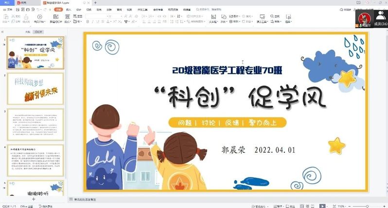 4月1日晚,2020级智能医学工程专业70班通过腾讯会议于线上开展学业导师分享会,会议由学业导师郭晨荣主持。首先,郭老师向同学们分享了她关于科技与创新的一些思考,进一步激发了同学们探究科技创新的兴趣。随后,郭老师为同学们梳理了不同科创竞赛基本情况、比赛流程以及准备材料等事项,在老师逐步深入的讲解中,同学们也对科创竞赛有了整体了解,并更深刻的明白科技创新的意义和目的。最后,她鼓励同学们要积极参与到科创活动中,提高自身的实践创新能力,科技创新能力已然成为国家实力最关键的体现,是当今社会活力的标志,大家要趁青春,勇追梦。通过此次会议,同学们思考颇深,受益良多,纷纷表示未来将在科技创新路上努力前行。