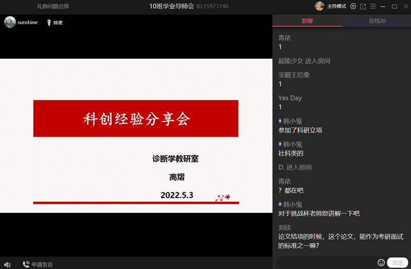 “坐而论道,不如起而行之。”为提高同学们的科研创新能力,5月3日下午,临床学院学业导师高熠组织2019级临床医学10班召开线上科创经验分享会。在本次会议中,高老师首先向同学们介绍了大学生创新创业项目的申报流程,她指出参加科创比赛是一个很好的锻炼机会,可以极大的锻炼动手实践能力,希望同学们勇于尝试。在如何确定选题的问题上,高老师表示,如果个人有明确的兴趣点,不妨从个人兴趣出发,以此作为自己确立学术方向的开始;如果个人兴趣点不明确,则可以参考课程学习、现实问题或往届经验来确定。随后,针对如何撰写立项申报书的问题上,高老师从“值得做”、“可以做”两个方面出发,对申报书的撰写要点进行解析,并分享了自己撰写科研申报书的经验。他讲到大创是一个边收集边撰写的过程,讲究笔耕不辍,希望同学们积极参与,加强学习和实践。本次经验分享会帮助同学们了解了大创项目的基本状况,对大家后续开展大创项目研究提供了有力的帮助。