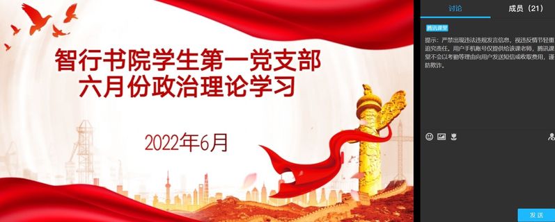6月17日,智行书院学生第一党支部通过腾讯课堂线上开展六月份政治理论学习。本次会议由党支部书记李莹莹主持,学生第一党支部全体党员参加。