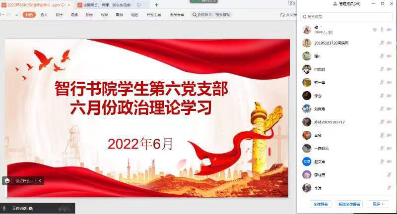 6月19日,智行书院学生第六党支部在腾讯会议平台线上开展了六月份政治理论学习。会议由党支部书记霍蕾主持,党支部全体党员参加。