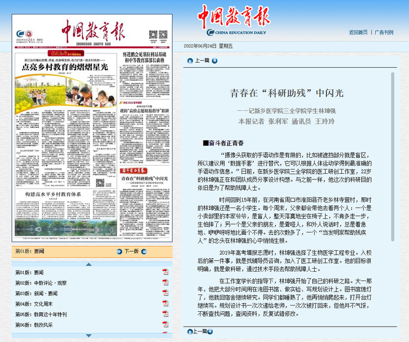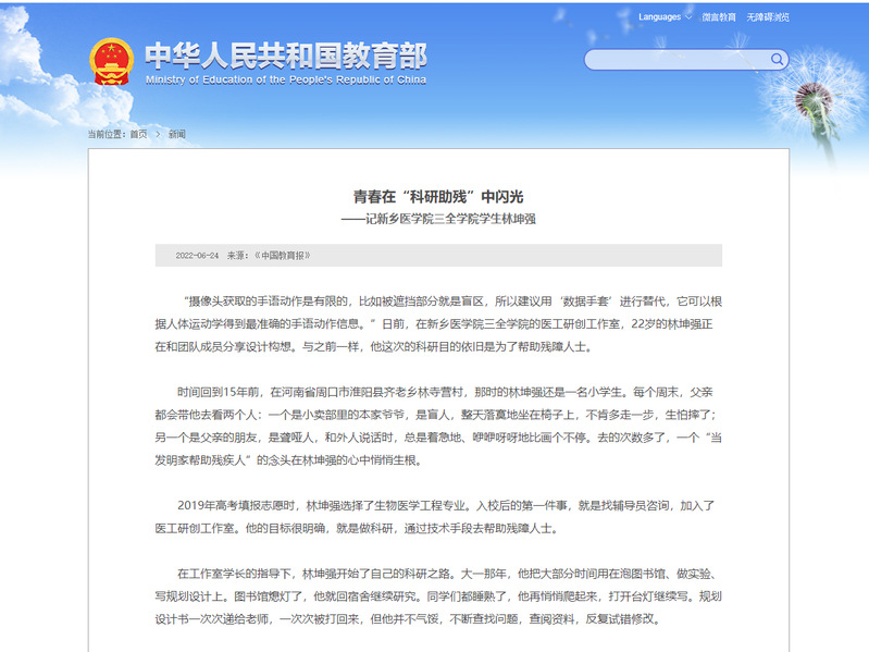 今日,智行书院2019级生物医学工程专业学生林坤强被中国教育报、教育部官网报道。
