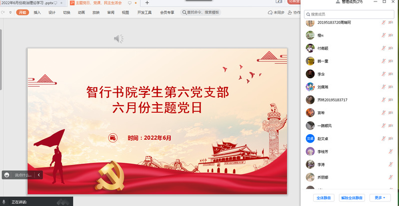 6月19日,智行书院学生第六党支部在腾讯会议平台开展“迎七一跟党走,我为党旗添光彩”主题党日活动。会议由党支部书记霍蕾主持,学生第六党支部全体党员参加。