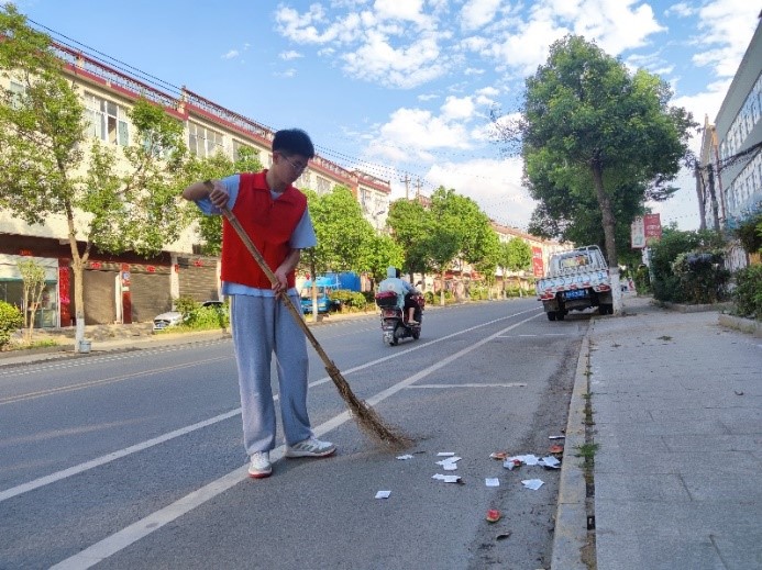 为以实际行动弘扬志愿精神,倡导社区文明新风尚,6月23-25日,团队成员夏洋、王静静手持大扫把、簸箕、扫帚和夹子等工具对小区干道、楼间支路、住宅楼前小路及路两侧绿化带的纸屑、垃圾袋和生活垃圾等杂物进行全面清理打扫,并归集到附近垃圾桶。大家不怕脏、不怕累,充分发扬雷锋精神和志愿者的先锋带头作用,经过努力,辖区面貌焕然一新。预备党员夏洋说:“参加这样的志愿者活动,感到非常荣幸,作为一名预备党员,有义务贡献自己的一份力量。”