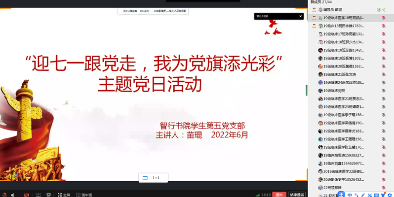 6月20日,智行书院学生第五党支部在腾讯会议开展“迎七一跟党走,我为党旗添光彩”主题党日活动。本次主题党日活动由党支部书记苗琨主持,党支部全体党员参加会议。