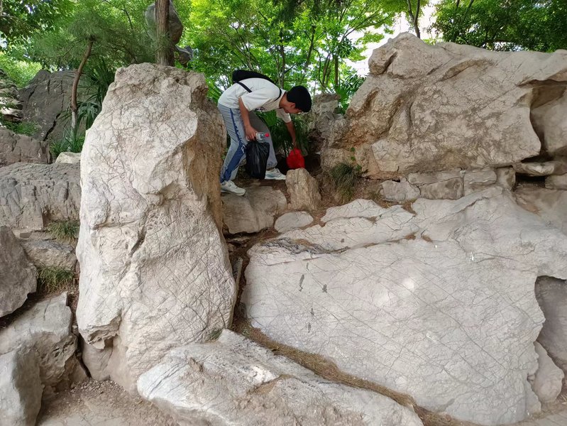 团队负责人杨亦坤对每个人进行大致的职能分配,准备工作结束后,团队成员拿着扫把和垃圾袋,沿着公园大门往内部进行垃圾拾捡,遇到乱丢垃圾的游客进行礼貌提醒,主动搀扶年迈老人走过石桥。在人多密集的地方发放环保倡议书,并对来往人群进行理论宣讲。面对大家“什么是环保?”“应该怎么去环保?”“大家都在乱丢垃圾,为什么不让我丢?”等一系列问题,团队成员微笑致意,并用耐心礼貌的态度对其进行一一的解答。面对环境脏、乱、差的特殊地段,团队成员团结一致不惧酷暑的进行打扫和整顿。