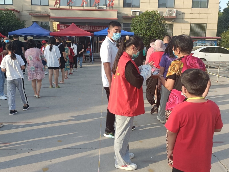 与此同时,成员崔译丹和杨欣茹来到鄢陵县新庄社区参与社区防疫工作。工作的主要内容是作为核酸检测点的志愿者,配合社区工作人员进行社区的日常核酸检测工作。两人分工明确,一人维持核酸检测队伍的秩序,另一人对群众的个人信息进行录入,两人配合默契,工作有序高效的进行。尽管核酸检测工作在清晨六点钟就开始,他们仍然积极来到社区广场配合检测。在结束志愿者工作之后,成员崔译丹和杨欣茹两人同其他志愿者对此次志愿活动进行了反思和探讨,从中体会到了基层社区工作者日常工作的艰辛与不易,更加深刻的认识到了“正是疫情面前一位位无名英雄的坚守,才有了如今我们的平安生活。”