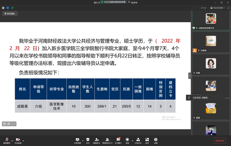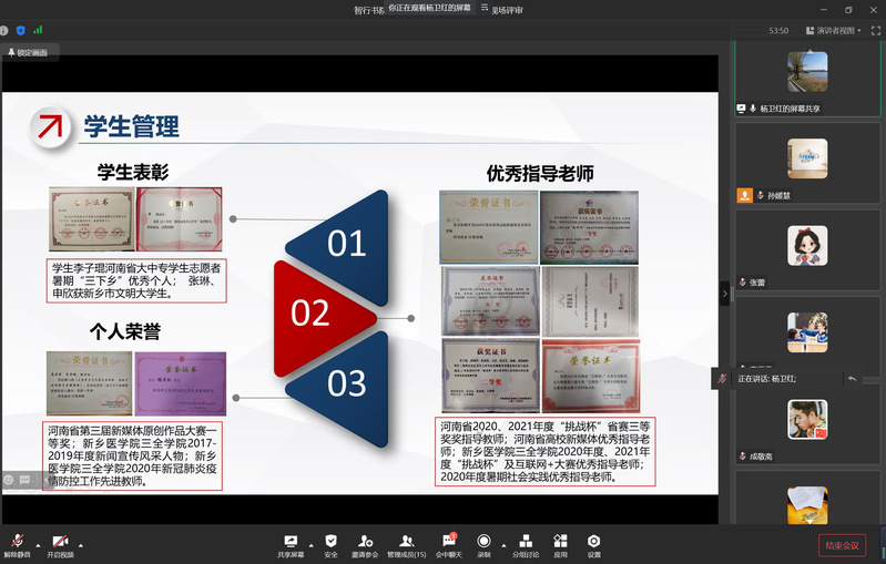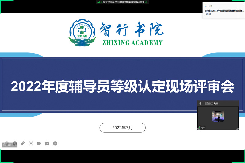 根据《新乡医学院三全学院辅导员等级化管理办法(修订)》文件精神和《关于开展2022年度辅导员等级认定工作的通知》的要求,7月29日上午,智行书院于企业微信“云上”召开辅导员等级认定述职汇报会。智行书院党总支书记刘凯、副书记王莉、学务部主任助理杨全民及书院全体辅导员老师参加了会议。