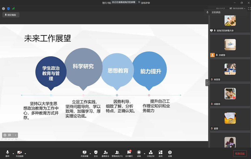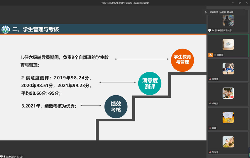 述职汇报会上,7位专职辅导员围绕个人在现任职级期间学生管理、教学科研、工作业绩、下一步工作计划四个方面的代表性业绩和贡献进行现场述职。此外,每一位汇报人还结合自身实际工作,聚焦辅导员主责主业,分享了工作中的特色做法与经验,总结所存在的问题并提出相应的改进措施,明确之后的努力方向,力求在新的学年里取得更优秀的成绩。大家纷纷表示将继续落实立德树人要求,以学生为主体,重视学生发展,做好学生引路人。
