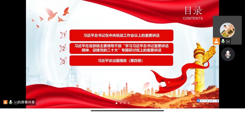 会上,胡海洋带领党支部全体党员集中学习了习近平在中央统战工作会议上的重要讲话、习近平在省部级主要领导干部“学习习近平总书记重要讲话精神,迎接党的二十大”专题研讨班上的重要讲话精神,刘冰领学了《习近平谈治国理政第四卷》重要思想。胡海洋强调,要完整、准确、全面领会和把握习近平总书记重要讲话精神,坚持原原本本学、逐字逐句读、融会贯通悟,以学习武装头脑、指导实践、推动工作,增强做好新时代统一战线工作的政治自觉、思想自觉、行动自觉。