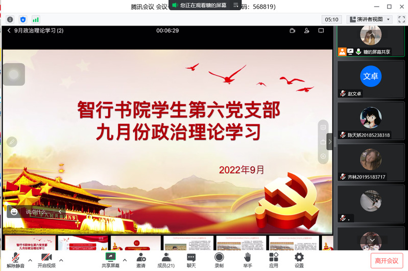 9月21日晚,智行书院学生第六党支部通过腾讯会议线上开展九月份政治理论学习,会议由党支部书记霍蕾主持,党支部全体成员参加。