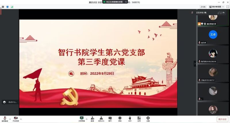 9月22日晚,学生第六党支部通过线上开展了以“筑牢信仰之基 贡献青春力量”为主题的党课,此次党课由党支部书记霍蕾主讲,党支部全体党员参加。