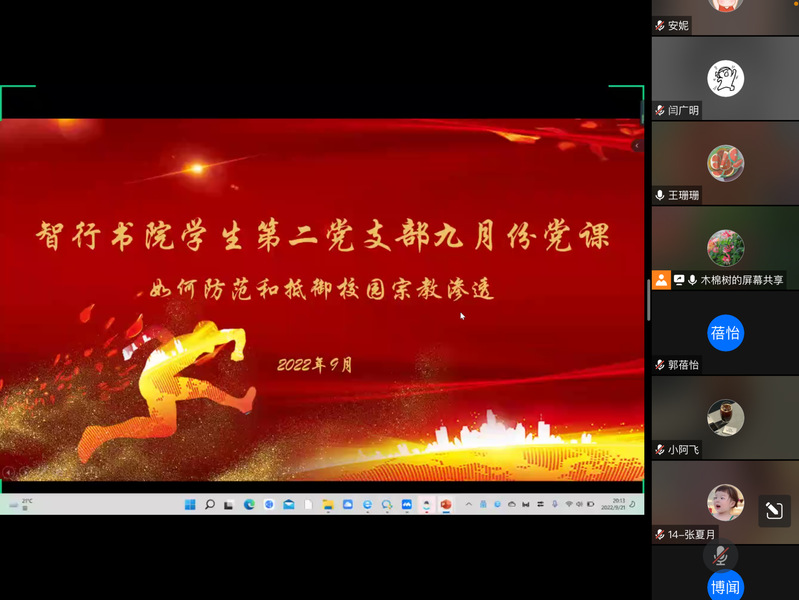 9月21日晚,智行书院学生第二党支部书记杨卫红以“如何防范和抵御校园宗教渗透”为主题线上开展专题党课,支部全体成员参加。