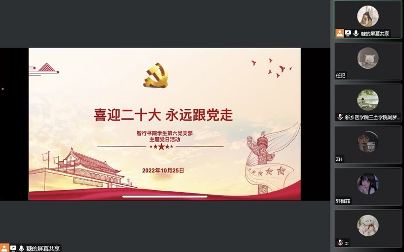 为展现当代大学生坚定不移跟党走的信念,勇于开拓创新的精神,10月25日,学生第六党支部开展了“喜迎二十大,永远跟党走”的主题党日活动,活动由党支部书记霍蕾主持,党支部全体党员参加。