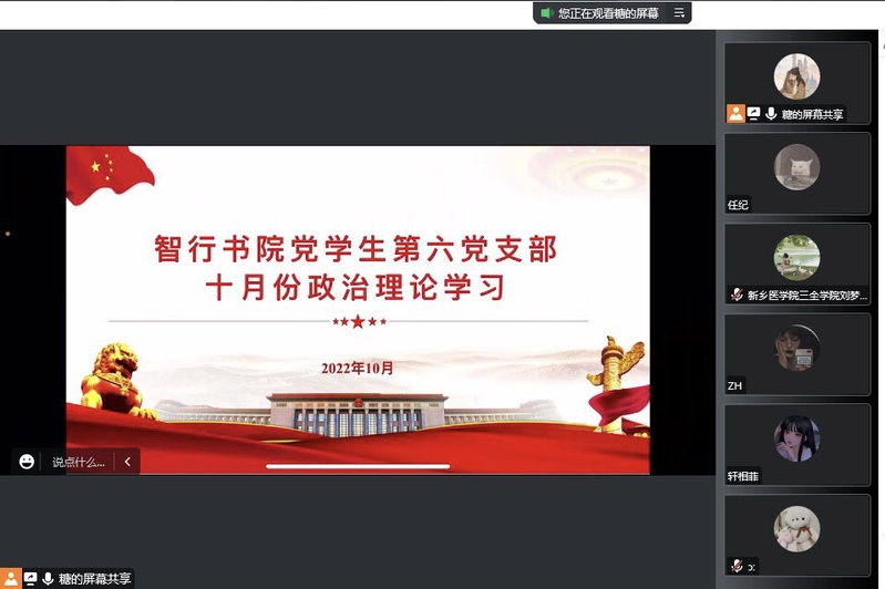10月24日晚,智行书院学生第六党支部通过腾讯会议线上开展十月份政治理论学习。会议由党支部书记霍蕾主持,党支部全体成员参加。