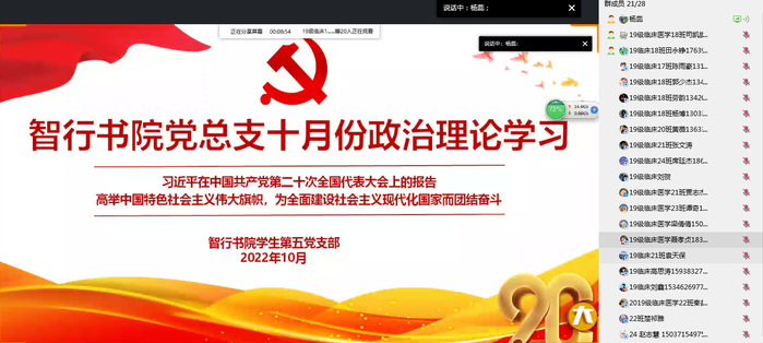 10月22日下午,智行书院学生第五党支部于线上召开十月份政治理论学习,本次学习采用“集中学习+研讨”的方式进行。会议由党支部书记杨蕊主持,支部全体党员参加。
