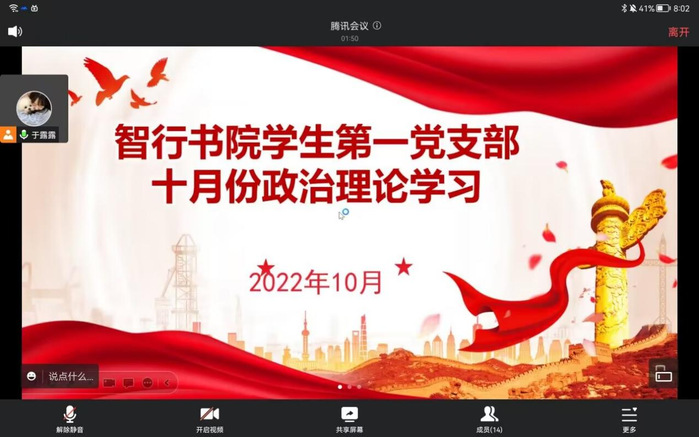 10月20日晚,智行书院学生第一党支部于线上开展十月份政治理论学习。会议由党支部书记李莹莹主持,党支部全体党员参加。