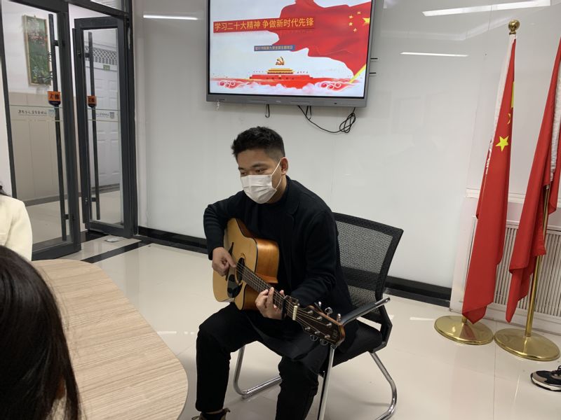 为更加全面深刻理解习近平新时代中国特色社会主义思想,支部书记高雯雯组织学生党员学习习近平总书记在党的二十大会议期间的重要讲话精神并开展相关特色活动。她强调作为新时代的青年党员大家要做的就是认真学习党章精神,把党章精神和要求内化于心、外化于行,坚定理想信念,强化责任担当。活动形式多彩多样,首先由全体党员集体宣誓入党誓词,随后,由段婷婷、张二垒和董梦瑶三位同志分享自己印象深刻的红色故事,让红色故事人人讲,革命精神代代。巾帼英雄赵一曼、真理种子的“种火者”陈望道、革命先烈方学元……一段段感人的红色故事让大家了解到了中国共产党的光辉历程,传承红色基因,弘扬革命精神。活动在陈余龙同志带来的吉他弹唱中达到高潮,大家情不自禁的一起合唱《我和我的祖国》,让全体师生党员发自内心感恩党、听党话、跟党走。同时大家还在线上集体观看了电影《可爱的中国》,进行积极的线上互动。