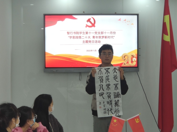 接着,支部党员以“学思践悟,青年筑梦”为主线,通过演讲、书法的创新方式,表达了各自的所思所想。学生党员陈家辉发表演讲:“青春有力量,民族有希望。当前,我们正处在‘两个一百年’的历史交汇期,实现中华民族伟大复兴是近代以来中国人孜孜以求的梦想。在这个历史进程中,青年大有可为,也应当有所作为,要让青春年华在为国家、为民族和为人民的奉献中焕发出绚丽光彩。”学生党员代鹏辉通过篆书和隶书两种字体分别书写了“矢志不渝,笃行不怠,不负时代,不负人民”“更好发挥法治,固根本,稳预期,利长远的保障作用,在法治轨道上全面建设社会主义现代化国家”,表达了对党、对祖国的热爱。