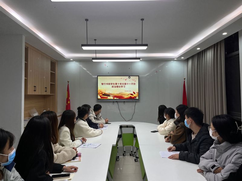11月23日晚,智行书院学生第十党支部在2号公寓楼党支部工作站开展十一月份政治理论学习。本次会议由党支部书记董婷婷主持,党支部全体成员参加。