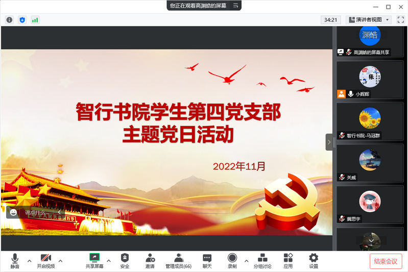 11月23日晚,智行书院学生第四党支部通过腾讯会议线上组织开展“学习二十大 奋进新征程”主题党日活动,活动由党支部书记高渊皓主持,全体党员参加。