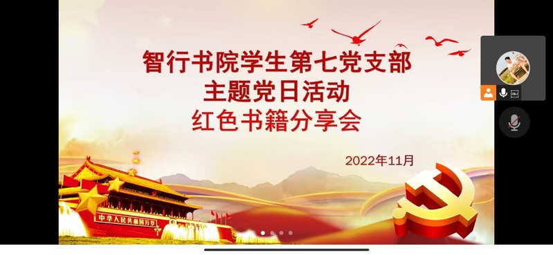 11月24日下午,智行书院学生第七党支部于线上开展了“学习贯彻二十大,助力学校高发展”主题党日活动,本次活动由党支部书记胡海洋主持,支部全体党员参加。