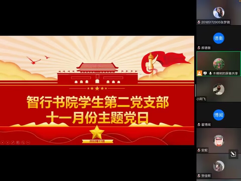 11月21日,智行书院学生第二党支部开展“学习二十大精神,争做新时代青年”主题党日活动,活动分为党的二十大理论知识学习研讨和党的二十大知识竞赛两个环节。活动由党支部书记杨卫红主持,支部全体成员参加。