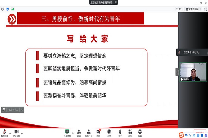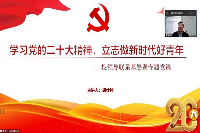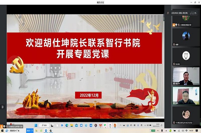 为学习宣传贯彻党的二十大精神,进一步密切与师生群众的联系, 12月13日下午,院长胡仕坤在“云”端调研指导智行书院工作,并为书院全体师生党员讲授专题党课。