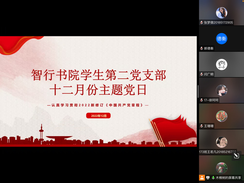 为提高党员政治思想,学习贯彻党的二十大精神,12月16日,学生第二党支部于腾讯会议开展了“学习党的二十大,领悟新党章蓝图”主题党日活动,活动由支部书记杨卫红主持,支部全体党员参加。