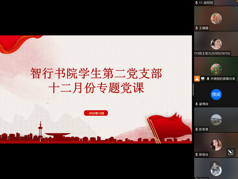 12月16日晚,智行书院学生第二党支部线上开展十二月专题党课,此次党课由党支部书记杨卫红主讲,支部全体成员参加。