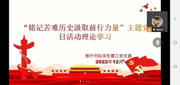 为缅怀过去、传递爱国热情,12月13日,智行书院学生第三党支部线上开展“铭记苦难历史,汲取前行力量”主题党日活动。活动由党支部书记成敬斋主持,支部全体党员参加。