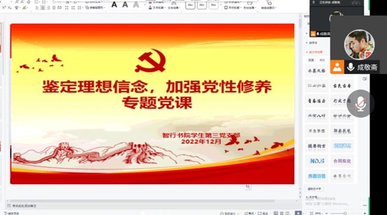 12月16日,智行书院学生第三党支部在腾讯会议召开“坚定理想信念,加强党性修养”专题党课学习,由党支部书记成敬斋讲授,党支部全体党员参加。