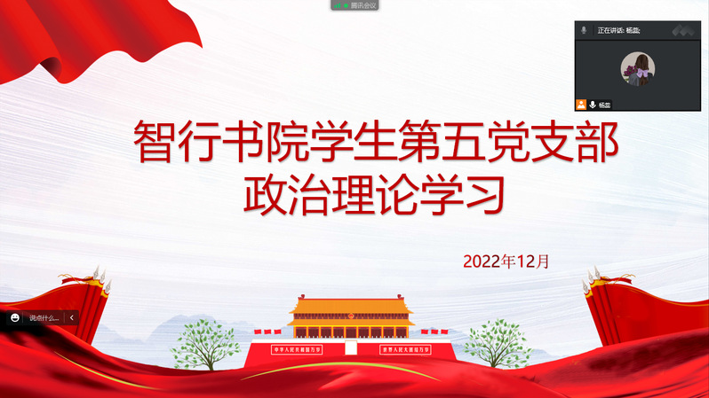 12月20日晚,智行书院学生第五党支部于线上召开十二月份政治理论学习。会议由党支部书记杨蕊主持,支部全体党员参加。
