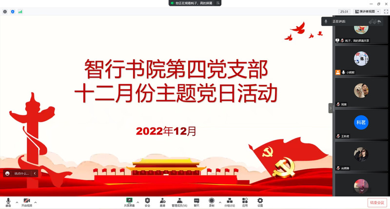 12月19日,智行书院学生第四党支部开展“学习党的二十大,贯彻党的新思想”主题党日活动,活动通过腾讯会议线上组织开展。活动由党支部书记高渊皓主持,支部全体成员参加。