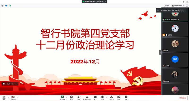 12月20日上午,智行书院学生第四党支部线上开展十二月份政治理论学习,会议由党支部书记高渊皓主持,支部全体成员参加。
