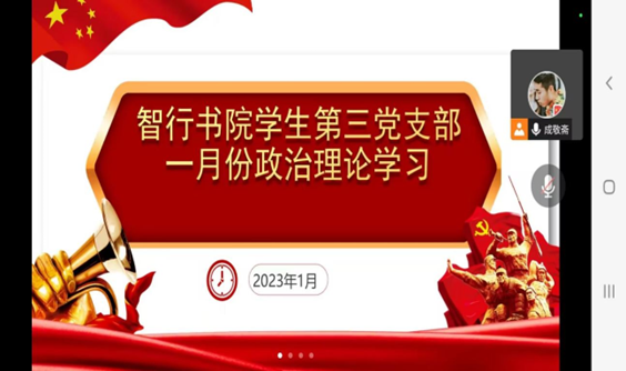 1月17日下午,智行书院学生第三党支部通过腾讯会议线上开展一月份政治理论学习。会议由党支部书记成敬斋主持,支部全体党员参加。