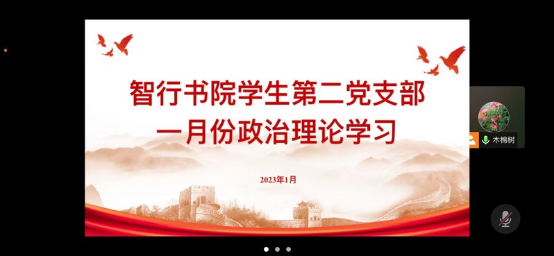 1月16日下午,智行书院学生第二党支部通过腾讯会议开展一月份政治理论学习。会议由党支部书记杨卫红主持,支部全体成员参加。