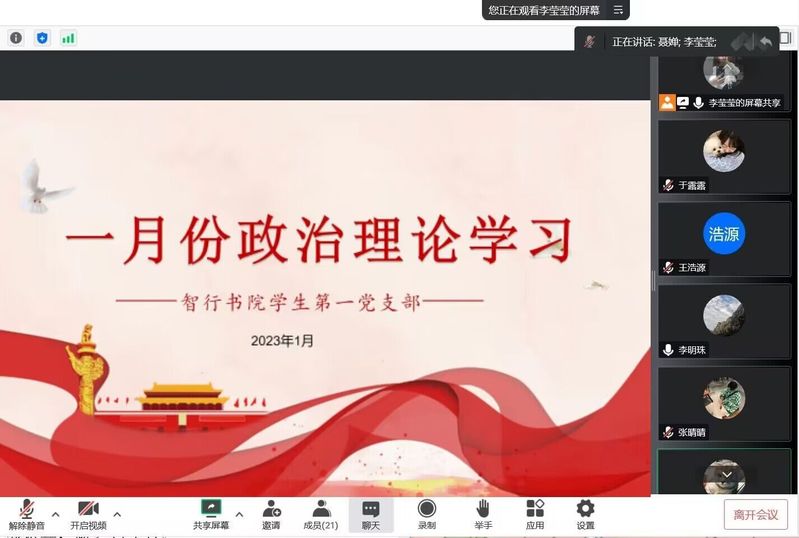 1月19日下午,智行书院学生第一党支部通过腾讯会议开展一月份政治理论学习。会议由党支部书记李莹莹主持,党支部全体成员参加。