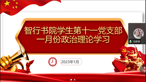 1月13日下午,智行书院学生第十一党支部通过腾讯会议开展一月份政治理论学习。会议由党支部书记冯婷婷主持,党支部全体党员参加。