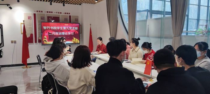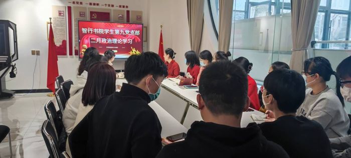 2月23日下午,智行书院学生第九党支部于新时代党员活动室采取“线上+线下”的形式,召开了二月份政治理论学习。会议由党支部书记高雯雯主持,党支部全部党员参加。