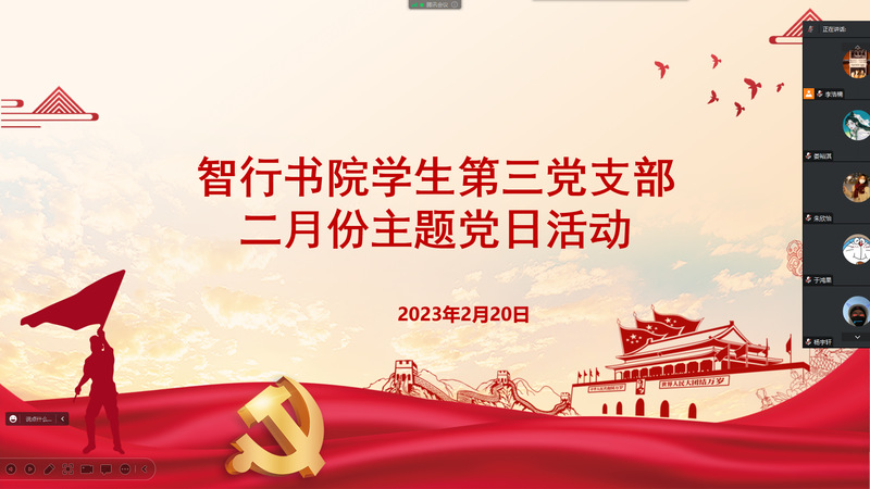 为深入学习贯彻落实党的二十大精神,2月20日,智行书院学生第三党支部开展了“‘学’当标兵、‘敢’当表率、‘干’当先锋”主题党日活动,本次活动由党支部书记成敬斋主持,学生第三党支部全部党员参加。